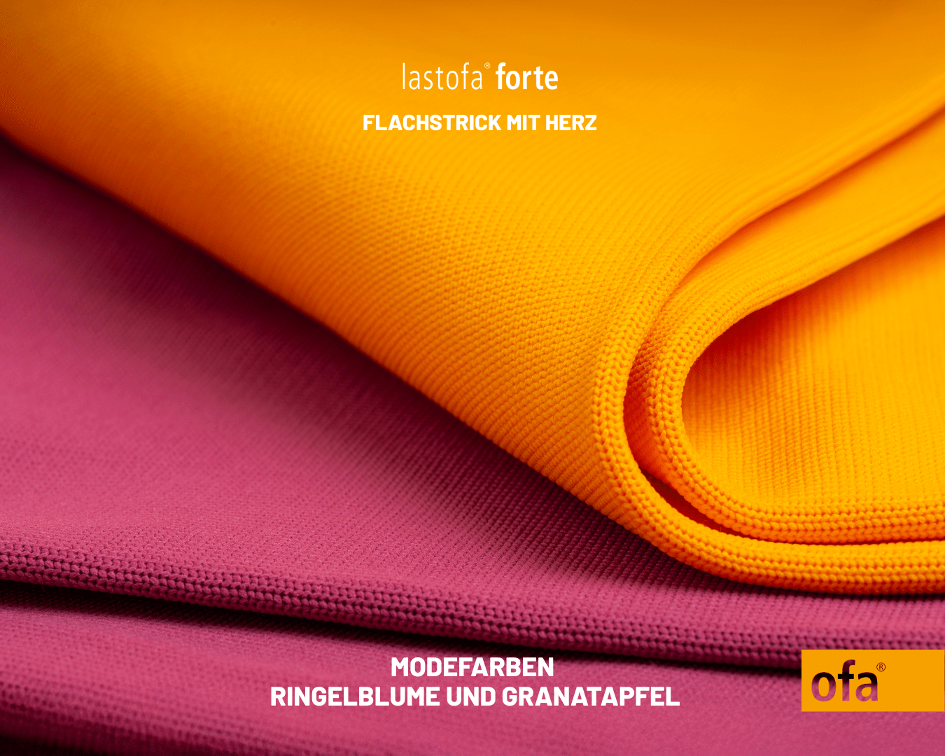 Die neuen Modefarben von Lastofa Forte heißen Ringelblume und Granatapfel. „Das Besondere an unserer flachgestrickten Qualität ist die Verwendung der natürlichen Merinowolle, die durch ihre hervorragenden Materialeigenschaften überzeugt.“ „Unsere Farbwahl ist ebenfalls stark von der Natur inspiriert“, erklärt Melissa Rettlinger, Produktmanagerin bei Ofa